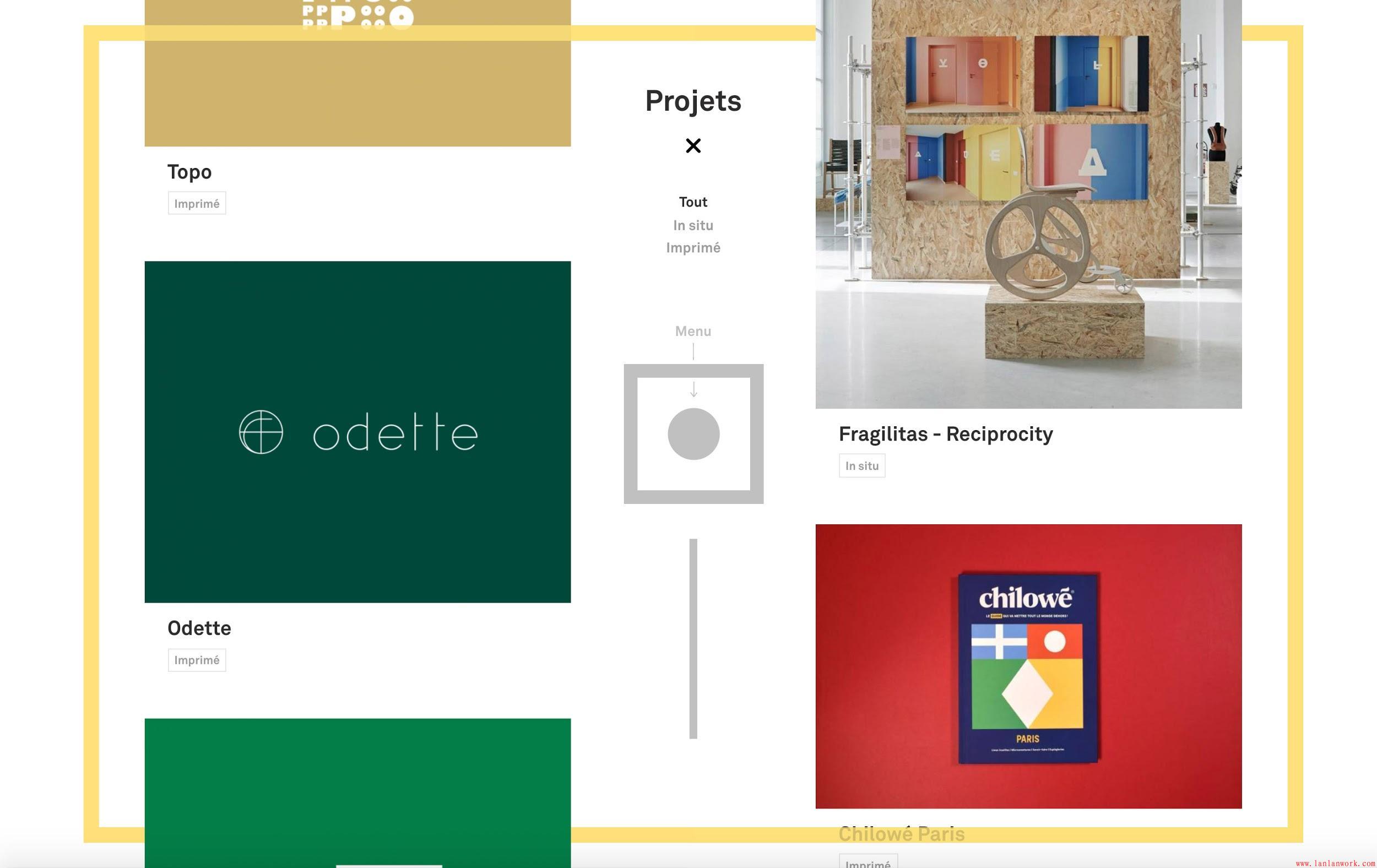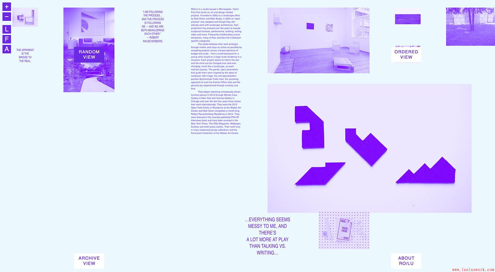 在大多數(shù)創(chuàng)意設(shè)計(jì)工作室的作品集中,作品沒(méi)有按層次組織,因?yàn)槊總€(gè)項(xiàng)目都是獨(dú)特的,并且被認(rèn)為同樣重要Ro / Lu網(wǎng)站的設(shè)計(jì)創(chuàng)造了一個(gè)動(dòng)態(tài)的構(gòu)圖,每次訪問(wèn)都有不同程度的驚喜,并鼓勵(lì)觀眾調(diào)查工作室的廣泛組合。因此,設(shè)計(jì)工作室的折衷,跨學(xué)科性質(zhì)由內(nèi)容的隨機(jī)顯示。