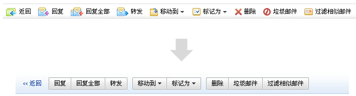 上面的是我們外貿(mào)郵界面目前的狀態(tài),所有的操作都并列擺放,隨著功能的增多,用戶識(shí)別的效率大大降低,優(yōu)化的方案是將相關(guān)的操作進(jìn)行分組,正是運(yùn)用關(guān)聯(lián)和并列的信息關(guān)系進(jìn)行設(shè)計(jì)