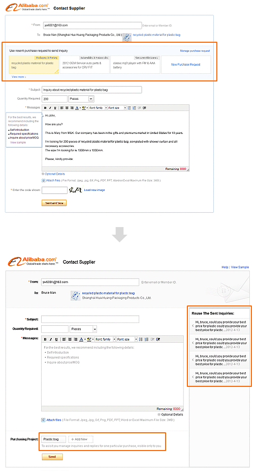 下面左圖框出部分是增加的功能,希望買家在發(fā)詢盤給供應(yīng)商時(shí)能對(duì)當(dāng)前的采購(gòu)需求建組并復(fù)用上次的內(nèi)容,在內(nèi)部討論時(shí),大家都覺(jué)得要強(qiáng)化該選項(xiàng),讓它成為其他內(nèi)容的統(tǒng)領(lǐng),然而調(diào)研的結(jié)果卻大相徑庭,用戶無(wú)法理解這塊內(nèi)容或干脆以為是貼的廣告內(nèi)容而忽略;