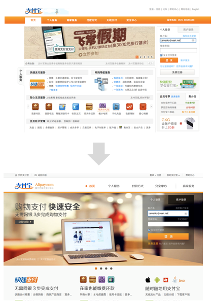 支付寶近期在測(cè)試新版首頁(yè),我們來(lái)到支付寶首頁(yè)最常進(jìn)行的操作就是登錄,而老版首頁(yè)視覺(jué)第一焦點(diǎn)是導(dǎo)航及活動(dòng)推廣位,導(dǎo)航只要在固定的位置,用戶在需要時(shí)能找到就已經(jīng)達(dá)到目的了,它不應(yīng)該成為頁(yè)面的視覺(jué)焦點(diǎn),除非用戶經(jīng)常在導(dǎo)航進(jìn)行切換以了解網(wǎng)站提供的服務(wù),在這點(diǎn)上新版首頁(yè)弱化了導(dǎo)航及其他應(yīng)用入口,強(qiáng)化支付寶本身的品牌傳達(dá)及登錄行為,很符合主流用戶的行為習(xí)慣